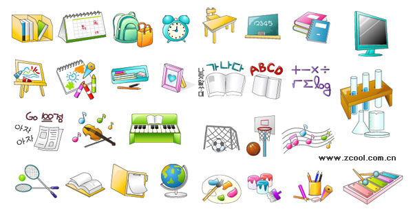 ai formats, including jpg preview, keyword: Vector icon, schools, study, bookcase, desk calendar, school bags, alarm clocks, desks, blackboards, books, display, draw, easel, chemical containers, music, violin, piano, football sports, sports, music, badminton, tennis, globe, palette, paint bucket, cute, hand-painted, vector material